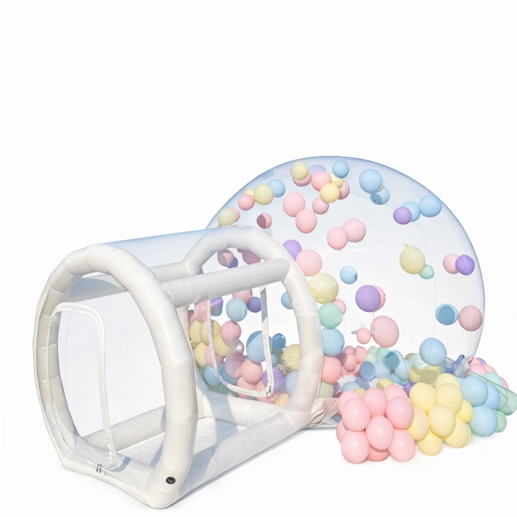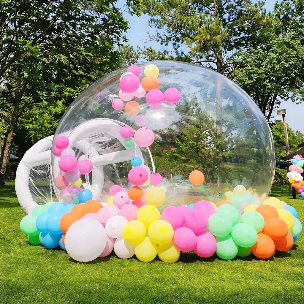 Nafukovací Crystal Bubble Dome je průhledný stan ve tvaru koule o průměru 3 metry, který vytvoří nezapomenutelnou atmosféru na narozeninových oslavách, svatbách, festivalech i firemních akcích. Díky plně transparentnímu provedení umožňuje kreativní výzdobu balónky, světly nebo tematickými dekoracemi a zároveň poskytuje chráněný prostor proti větru.