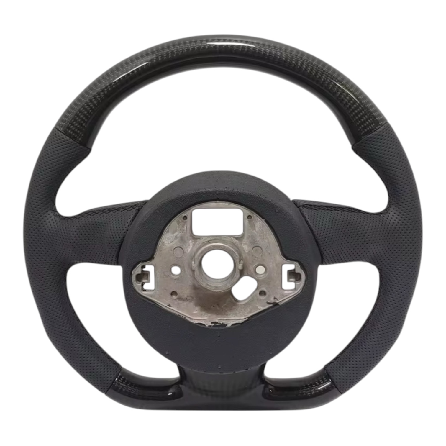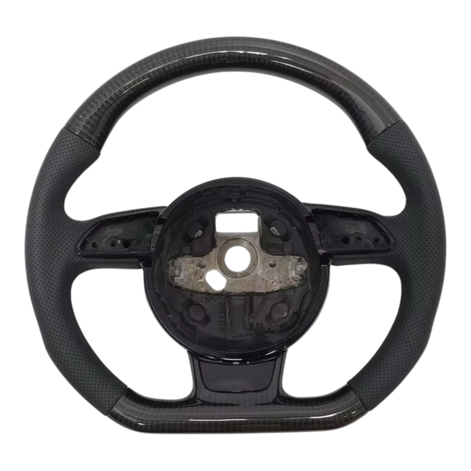 Horní a spodní část volantu je tvořena karbonovým dekorem, zatímco boční úchopy jsou potaženy perforovanou kůží, která zajišťuje maximální komfort a jistotu při držení. Tříramenný design podtrhuje moderní a sportovní vzhled interiéru vozů Audi.