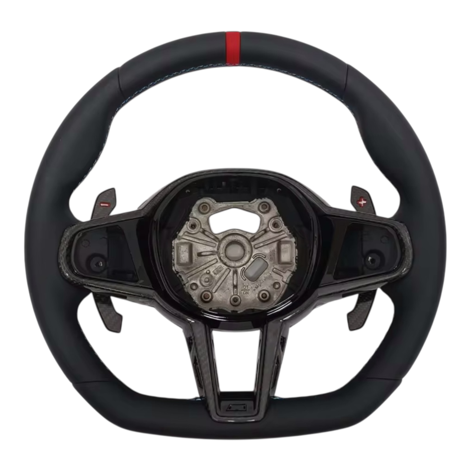 Volant je potažen kvalitní černou kůží s kontrastním prošíváním, které zajišťuje pevný a příjemný úchop. Karbonové prvky v oblasti ramen podtrhují prémiový a sportovní charakter. Součástí jsou také pádla pod volantem pro řazení (+/-), což zvyšuje zážitek z jízdy.