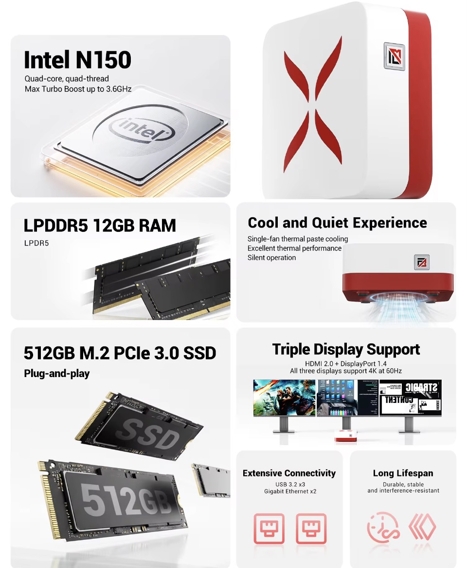 T150 je moderní mini PC navržené pro domácí použití, studium i kancelářskou práci. Díky čtyřjádrovému procesoru Intel N150, rychlé DDR4 paměti a SSD disku nabízí svižnou odezvu systému Windows 11 Pro a plynulý chod každodenních aplikací.