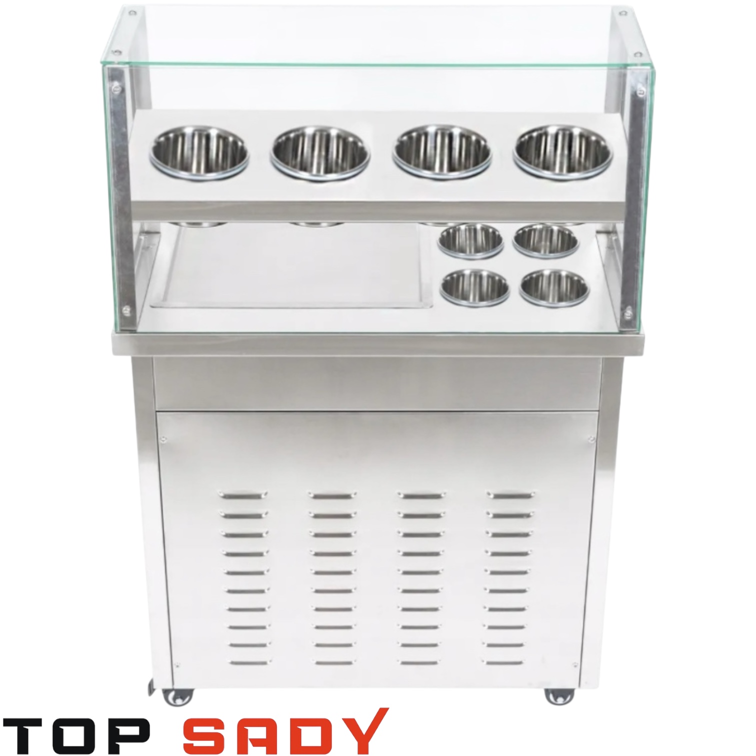 Model 2B1 je profesionální rolovací (thai) zmrzlinový stroj s horní skleněnou vitrínou. Ideální pro výrobu zmrzliny přímo před zákazníky – atraktivní způsob prodeje, který zvyšuje zájem i tržby.